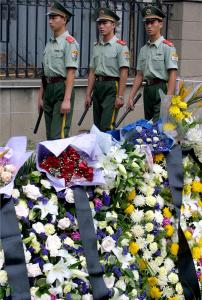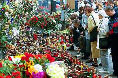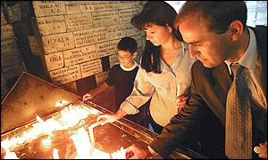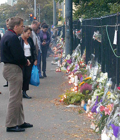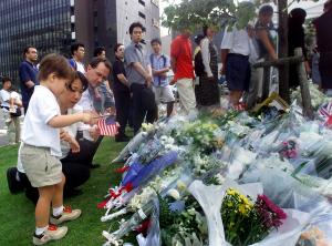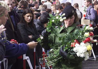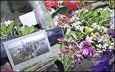 Connor O'Carrigan, 3, and his mother Charmaine, laying down some flowers